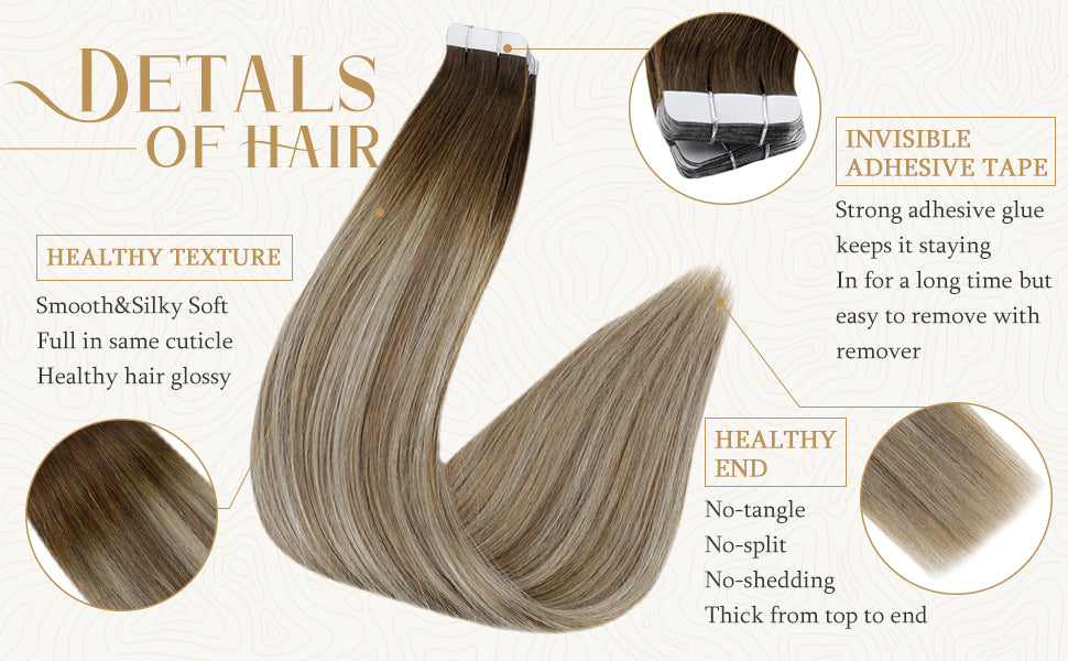Tapes: Strong, safe, small and invisible PU tapes.Details of hair: Tape size: 0.8cm * 4cm Texture: Straight, and a natural wave after washing is normal.
