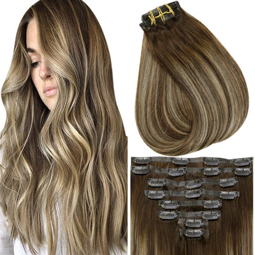 Fshine Clip in Extensions 100% Remy Human Hair 7 Pcs Balayage Highlights #4/24/4
